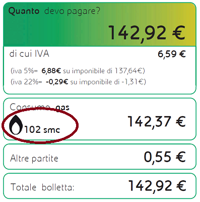 B) scrivi il valore "Totale fornitura gas smc" (smc sta per standard metri cubi ossia l’unità di misura del volume del gas in condizioni di temperatura e di pressione “standard”)